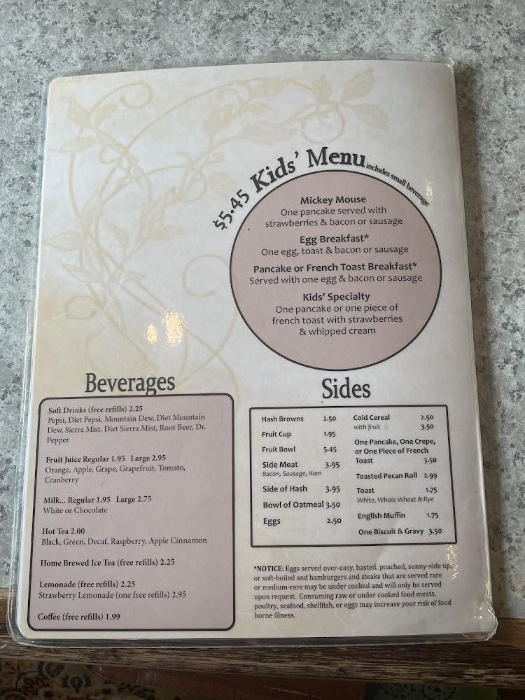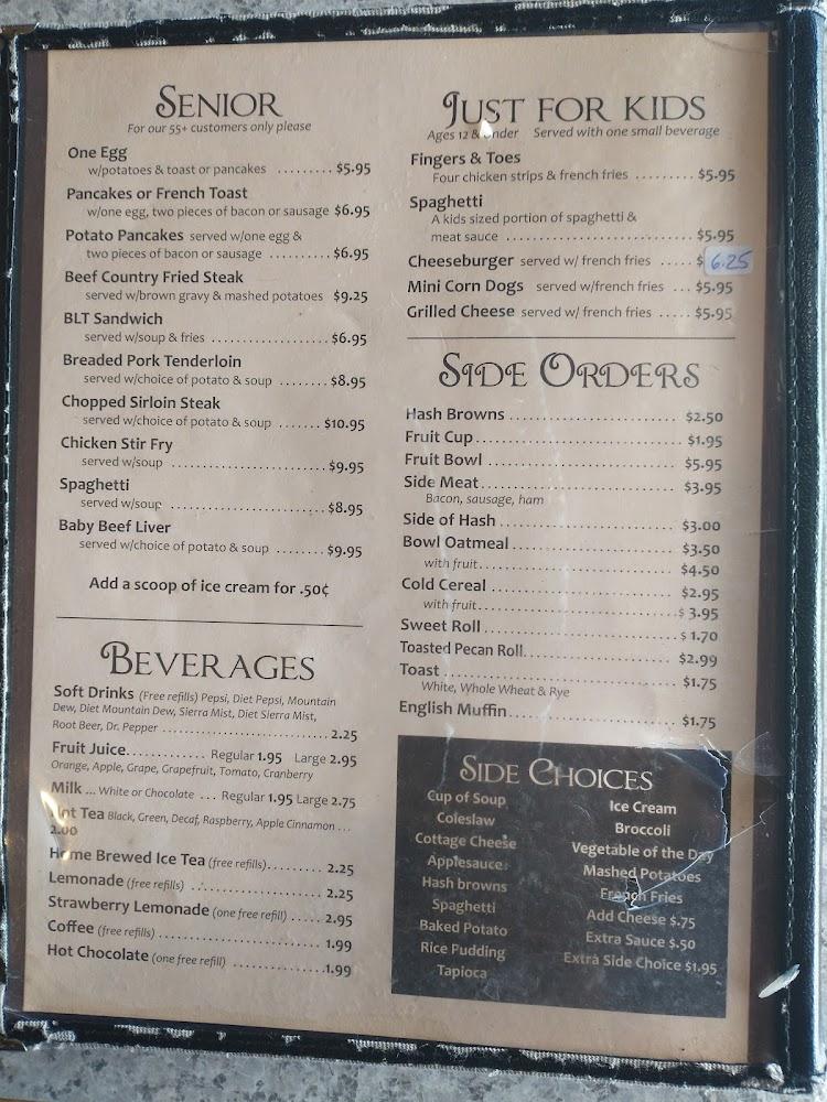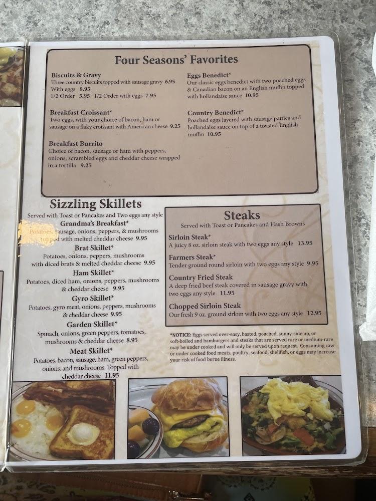 Four Seasons offers a diverse menu that caters to various tastes and appetites. Breakfast shines with options like omelettes, pancakes, and signature dishes. Lunch and dinner options include classic sandwiches, wraps, and hearty dinners like BBQ ribs and baked meatloaf. Salads and lighter sides balance the menu. Kids enjoy a dedicated menu, featuring smaller portions of beloved favorites.